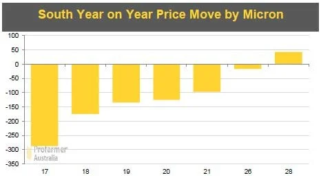 The AWEX EMI price is currently 1,107c/kg clean, a reduction of 55c/kg or 6% year on year. This is a moderate price reduction when compared to all the doom and gloom coming from the industry. As the Profarmer graphs below illustrates, all micron grades have decreased. Fine wools have fallen further than the broader merino clip, however due to the comparatively higher opening value, <18 micron wool is still the best performing micron category.